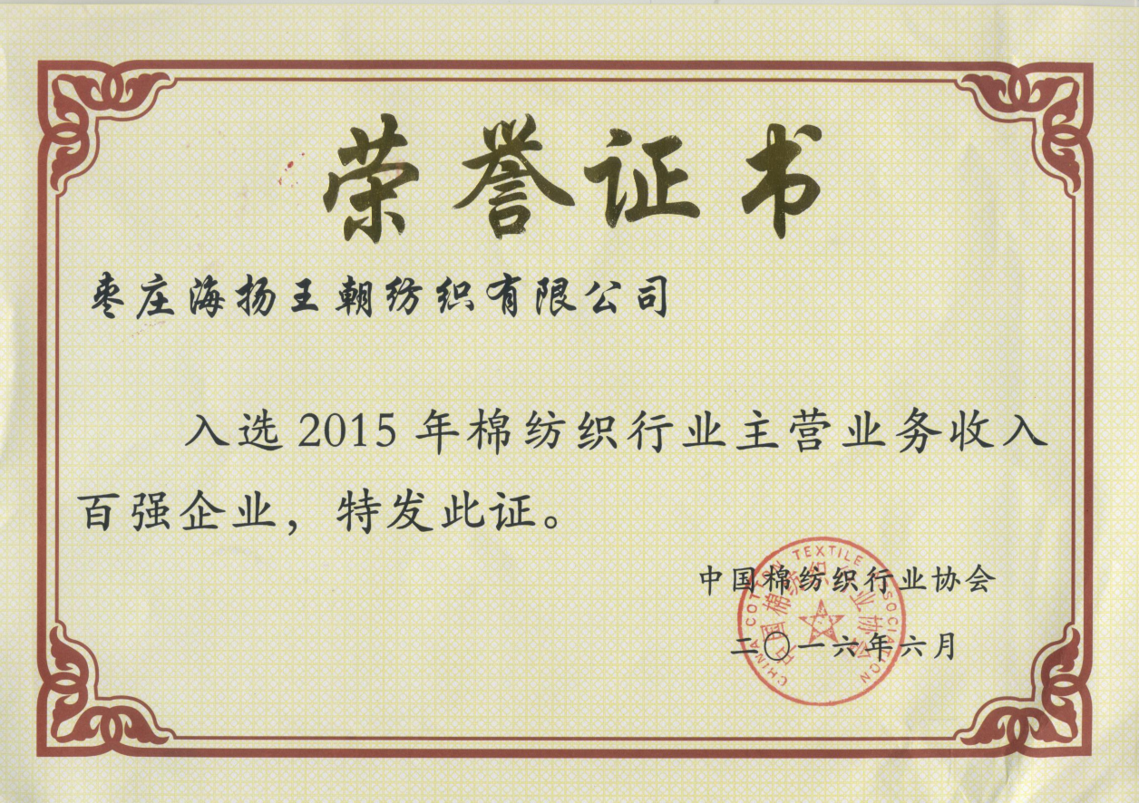 中國棉紡織行業(yè)協(xié)會(huì)于2016年6月27日公布了“2015年中國棉紡織行業(yè)主要經(jīng)濟(jì)效益指標(biāo)排名”,棗莊海揚(yáng)王朝紡織有限公司喜獲“2015年棉紡織行業(yè)主營業(yè)務(wù)收入百強(qiáng)企業(yè)”和“2015年牛仔布行業(yè)主營業(yè)務(wù)收入十強(qiáng)企業(yè)”兩項(xiàng)榮譽(yù)。